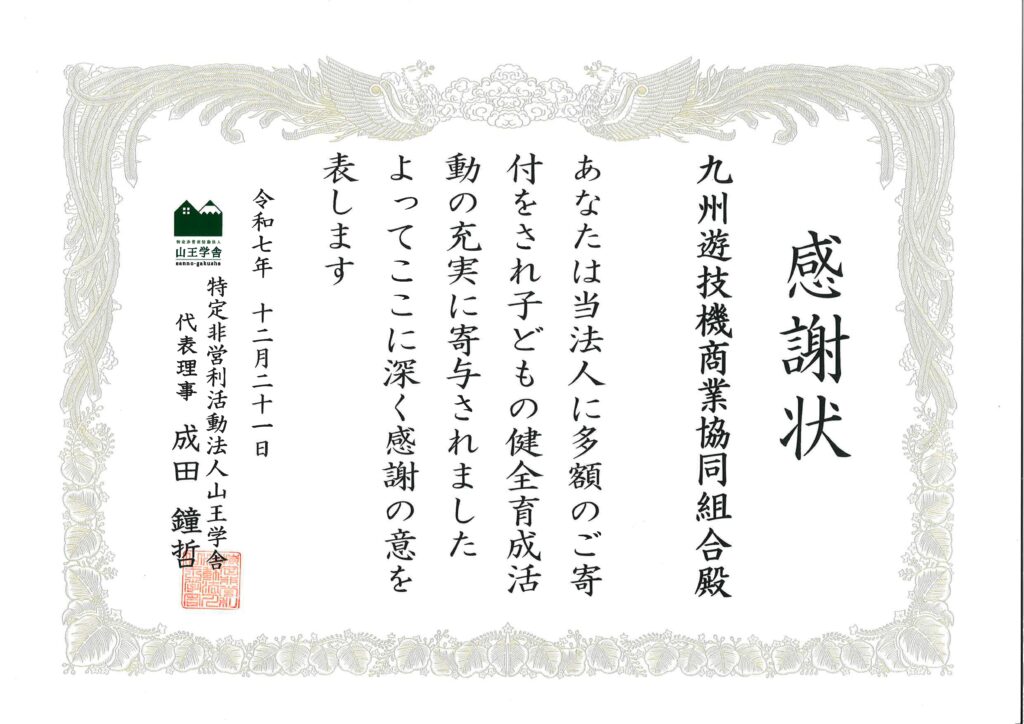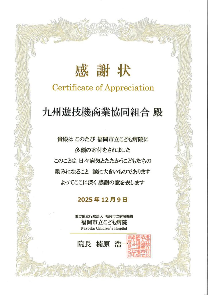九州遊技機商業協同組合で令和7年度に実施した社会貢献活動(清水ふれあいまつり・チャリティーゴルフコンペ)の収益金及びチャリティー参加費を、福岡市東区にある「福岡市立こども病院」と福岡市博多区の子ども食堂等を運営している「特定非営利法人 山王学舎」へ寄付を行いました。